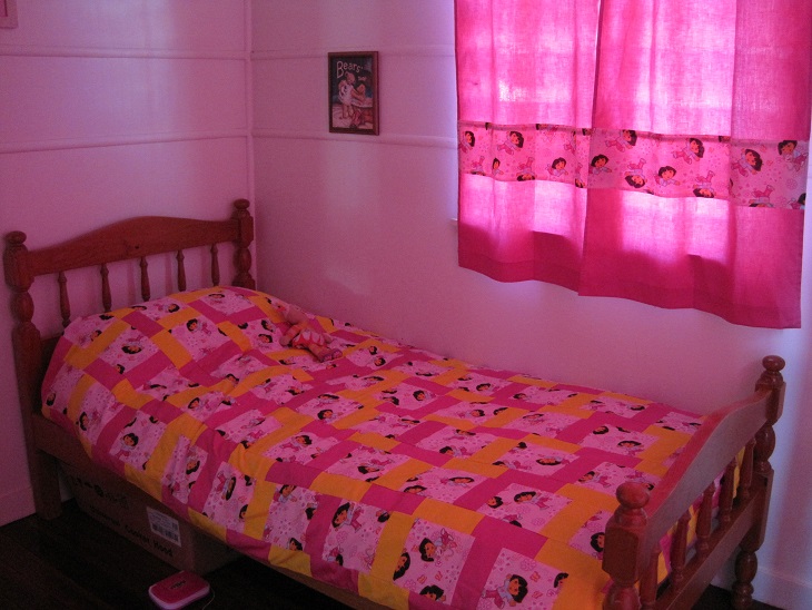 As promised, today I am able to unveil the final photos of the doona cover and curtains.  Like so many things in life there was no firm plan to make these but they just evolved because of an email I received from someone selling pieces of fabric in order to downsize their stash.  One of the pieces was 1.9 metres of ‘Dora the Explorer’ fabric which was impossible to pass up since I knew how besotted Miss O is at the moment with everything ‘Dora’.  I had no preconceived ideas about what I would make as I was unsure of the quality of the fabric or the size of the design.  One thing led to another and I decided to make a patchwork doona cover and some curtains for her room.  I bought the plain fabric from Spotlight and also some sheeting to make the underside of the doona cover.