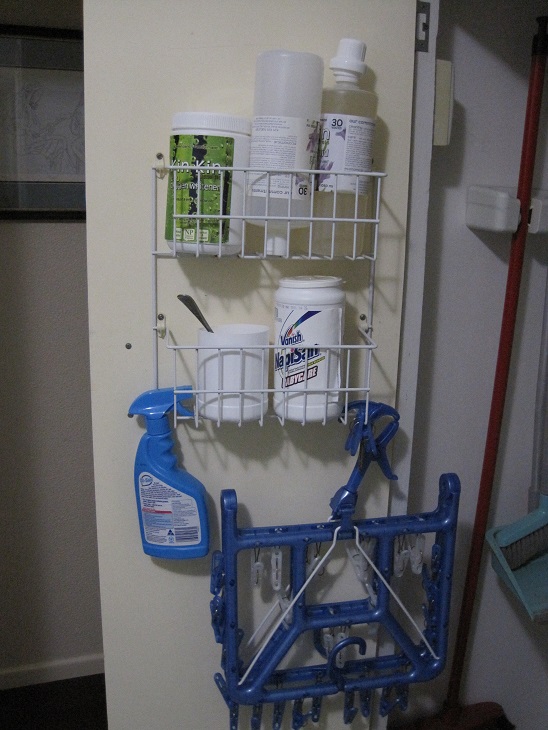 2011-04-13 05On the other side there are 2 shelves – top shelf has batteries, light bulbs, cleaning cloths and cleaning vinegar.  Lower shelf is cleaning products, shopping bags and tulle bags for fruit and veg shopping.
