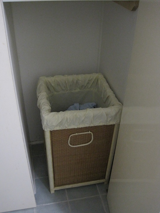 2011-04-13 06Finally, the laundry basket.  After all, it is a laundry.  This basket once had a hinged lid which eventually broke and it had a fabric lining which was fixed.  The lining became worn and discoloured so I removed it and made a removable lining from an old sheet.  I periodically take it out and air the lining and it goes in the wash occasionally.
