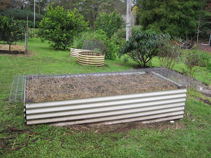 Since we do not have the vegetable garden area fenced we have a variety of fencing/covering methods to exclude the chickens from the very tempting new seedlings and mulch. Fencing is on the ‘To Do’ list. One day…………it will happen.