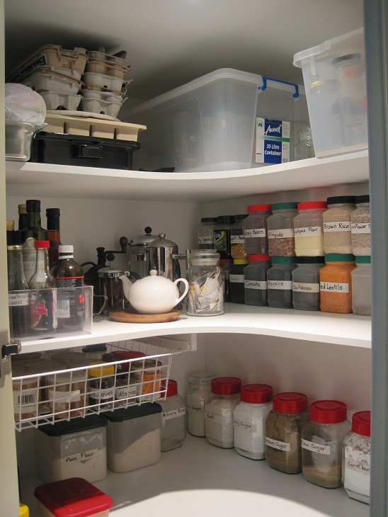 I have a moderate-size walk-in pantry in the corner of my kitchen. It was not spectacularly untidy but I did need to clean the shelves, check for any ‘orphans’ lurking in the back corners and generally get things sorted. I do not have a before photo but here it is when I had finished.