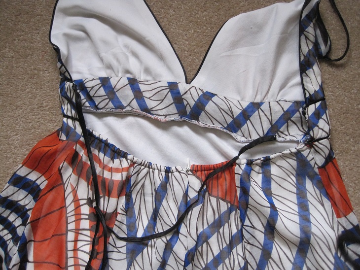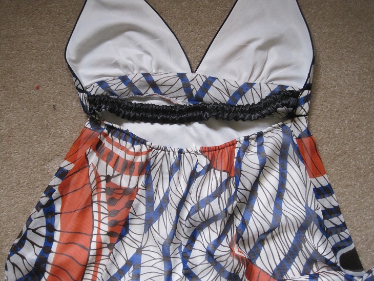 I removed the tie and using some black satin from my collection I made a band and threaded it with wide elastic. It is secured at both ends and has enough stretch for the dress to be slipped over head and shoulders. This is much sturdier than the original flimsy ties but still in keeping with the rest of the dress and the black satin halter neck ties.