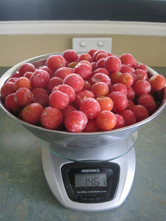 Frozen tomatoes on scales