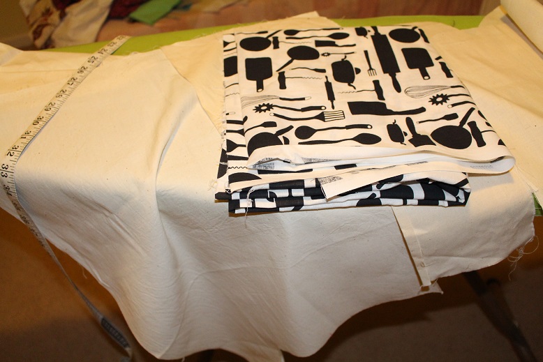 This photo of my ironing board covered in fabric tells this week’s story. I decided to take a break from dressmaking and make a start on a cover for my KitchenAid mixer which lives on the bench in the corner of my kitchen. I bought this fabric a few months ago. It is off-white with black silhouettes of kitchen utensils which seemed perfect to use for this project. I washed and ironed the fabric this morning and found various pieces of calico for the lining. I intend to use some bamboo batting to pad it and machine quilt the pieces before assembling the cover. I have cut out the calico pieces.