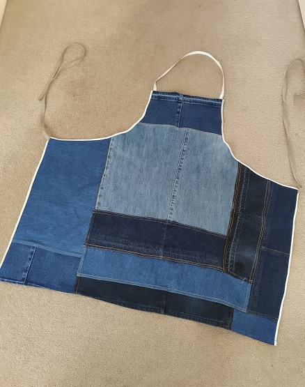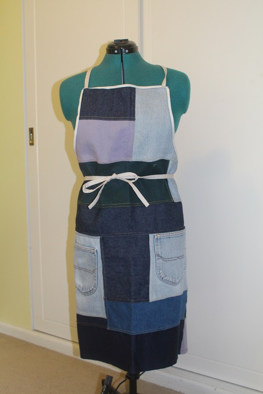 Using an existing apron for a template I made a pattern then a patchwork denim apron for myself. The neck strap, binding and ties were all salvaged or remnants.