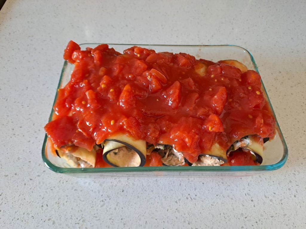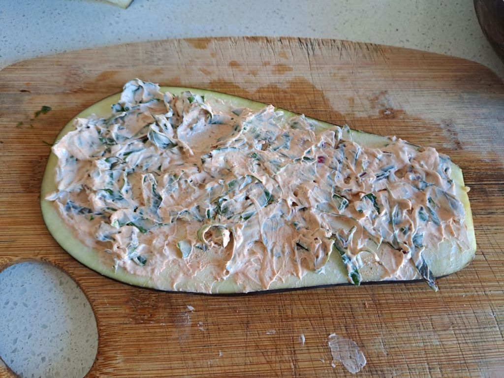 Thinly slice the eggplant. Lightly cook the slices in a pan or in airfryer.
