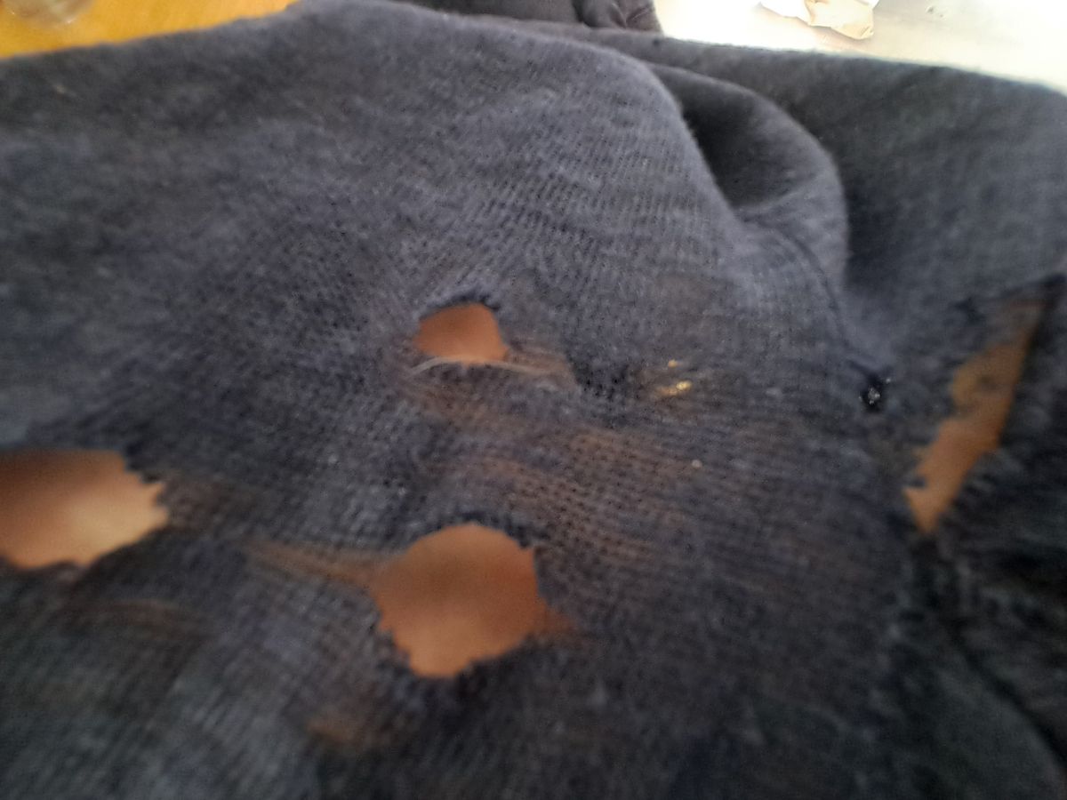 A top of mine had a different fate. I bought a very fine knitted top for $5 secondhand almost exactly 2 years ago. According to the label it was linen. Anyway, it had been gradually getting thinner in the underarm area and I suspect that was was why it had been donated in the first place. It has finally become unwearable so I have added it to the pile for textile recycling. The photo shows a close-up of the multiple small holes under one arm and the other side was in a similar state.