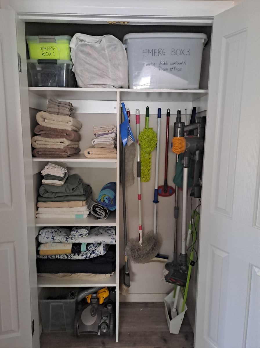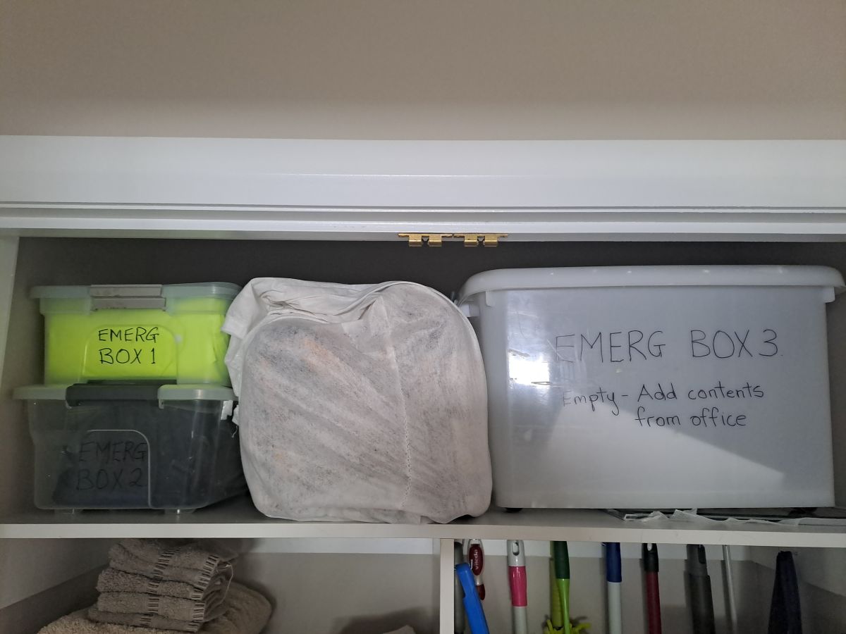I have 2 emergency boxes stocked with detailed lists attached and a third box in which to collect a few other things in order to leave immediately if required. There is also a bag with 2 woolen blankets. These do get used on beds during the winters months but this is where I will store them during the summer and they form part of the emergency kit. I have lists of everything. These are all stored in the top of the linen cupboard which is located centrally in the house. It is funny that I still refer to it as a linen cupboard as there is more of other stuff than linen in it.