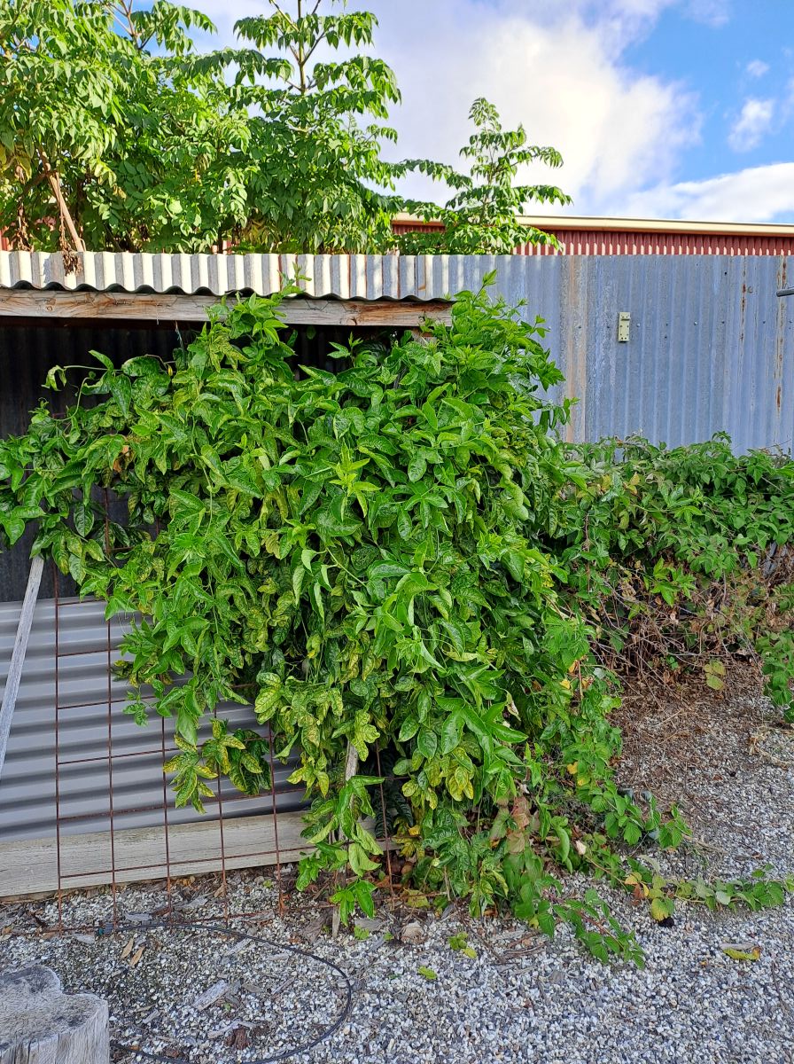 The passionfruit vine was here when we moved in but it did not amount to much. There were no fruit the first year and a few last year. The vine seems to have thrived in the past year despite no attention from us. We are now reaping the rewards.