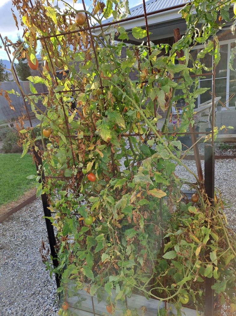 This year I planted one Roma tomato plant which has been a raging success with over 20kg of tomatoes from this single plant. I managed to nurse it through the 40C+ heat in January and we are certainly nearing the end of the crop. The trellised archway provided the perfect support and allowed for plenty of airflow.