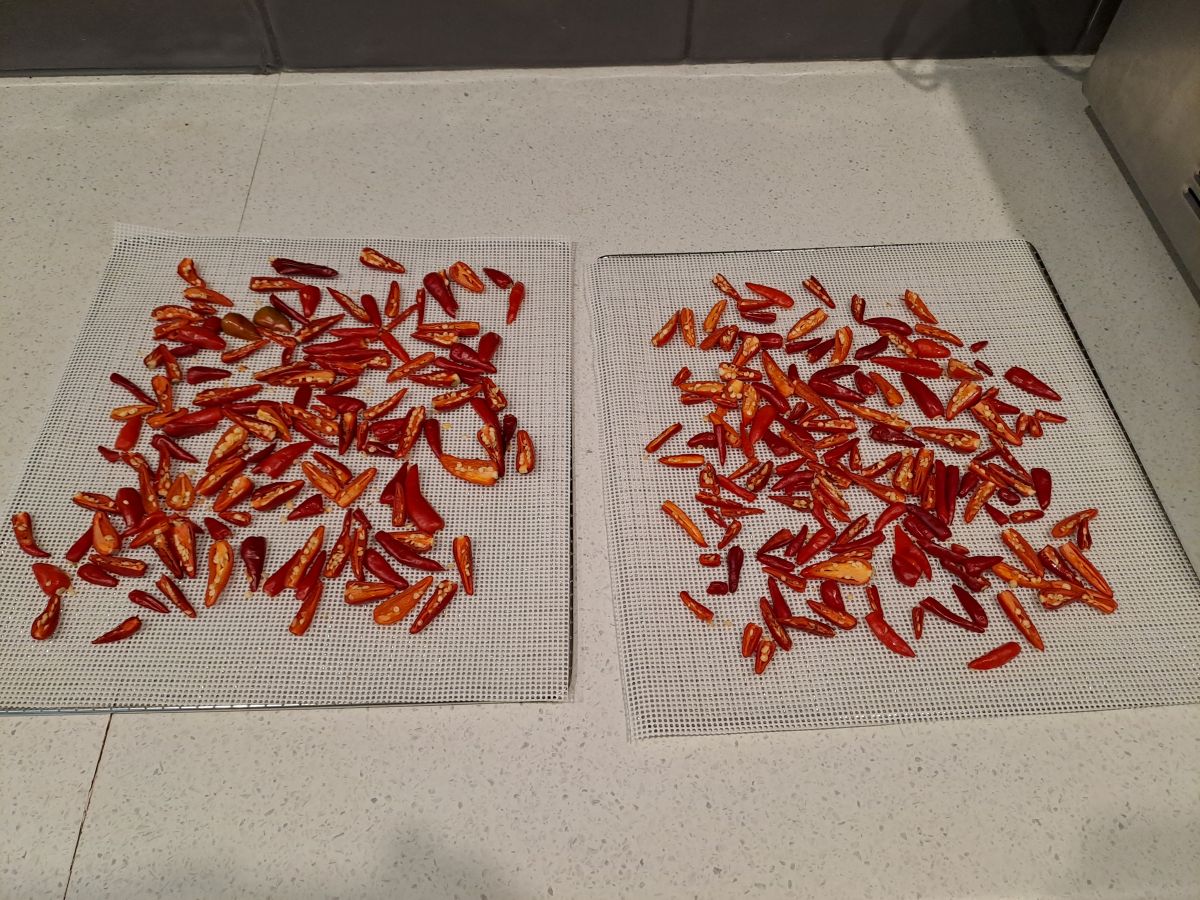 This morning I picked a bowl full of birdseye chillies. I removed the stalks and cut them in half lengthwise and here they are ready to go in the dehydrator. Once they are dried I will grind them to add to the jar of chilli powder.