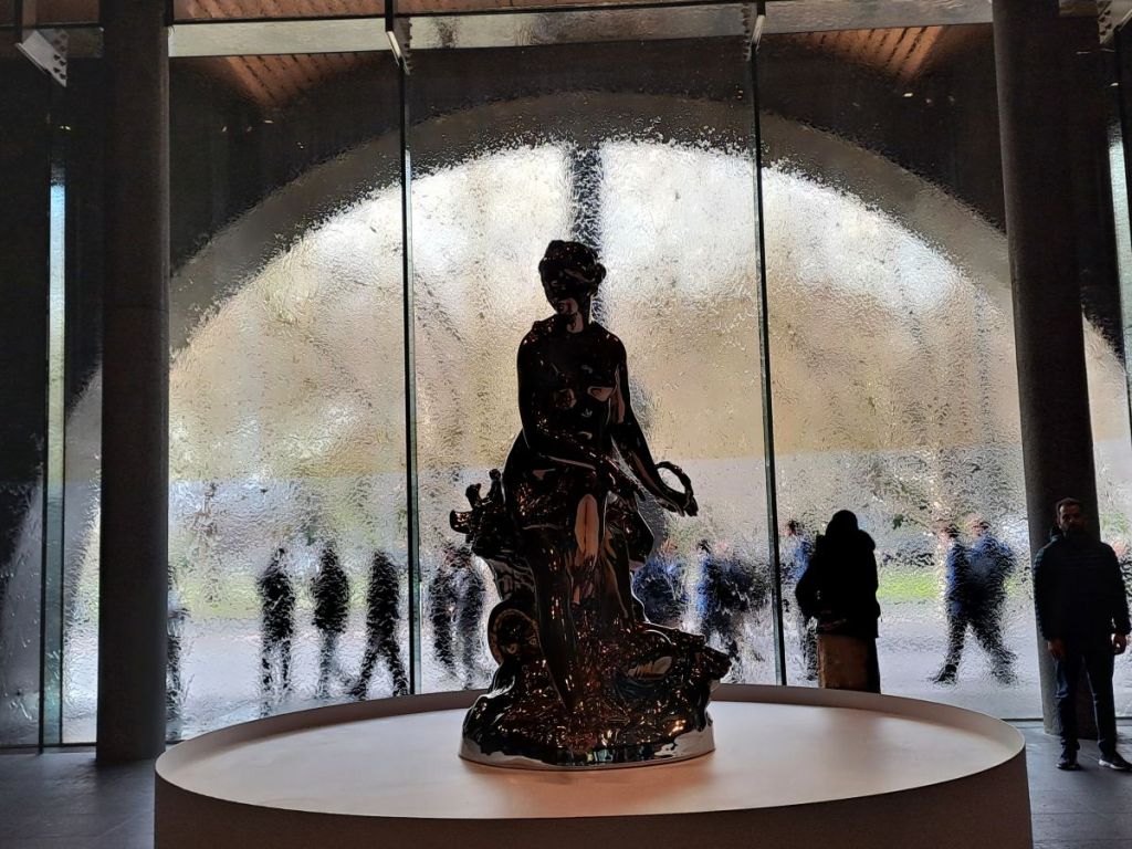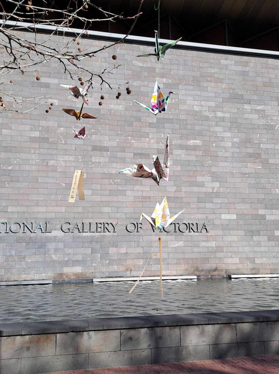 However, the first thing that caught our attention was before we even entered the gallery. The bare plane trees on the footpath outside the gallery were adorned with a series of threads of paper cranes as today is the 80th anniversary of the bombing of Hiroshima. This modest yet powerful memorial was appreciated by many people passing by.