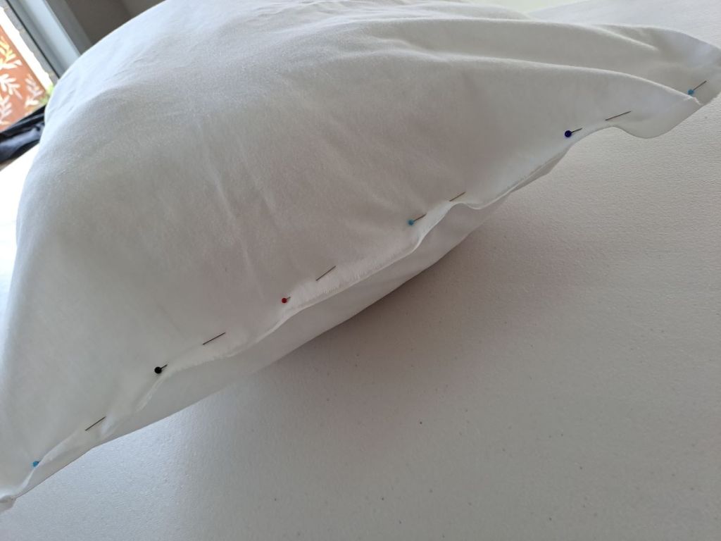I used the old cover to cut a new piece of fabric from some offcuts of sheeting in my stash and stitched 3 sides before carefully replacing the pillow inside.