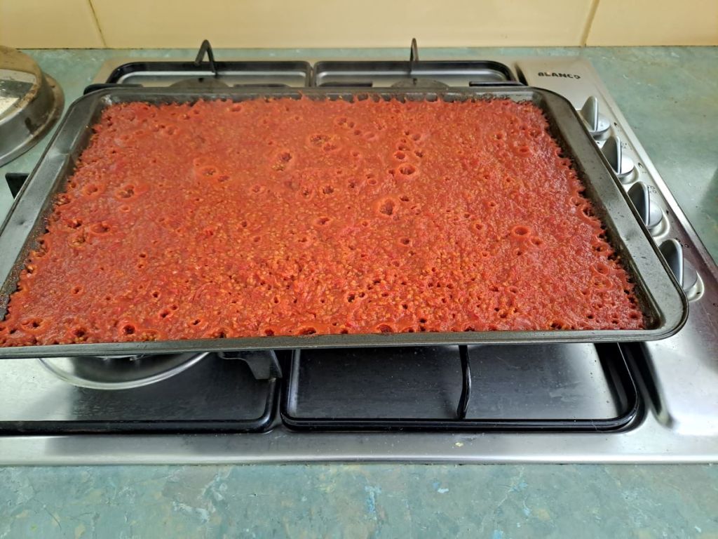 Another method that can be used is to puree the tomatoes in a blender (after washing and destalking them). This creates quite a watery mixture so I simmer it until reduced by at least half. You can also finish the process in the oven which seems to add some richness to the flavour, however, this is not an essential step. This is my version of tomato paste.