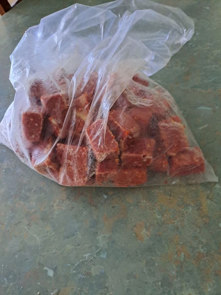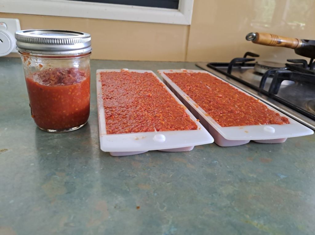 Once they are frozen the cubes can be bagged up. This is 1.75kg of cubes which came from about 5kg of cherry tomatoes.
