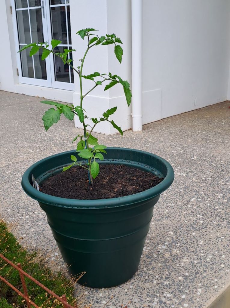 Another pot now holds a relatively advanced Roma tomato plant which we also bought last week. It is at the other end of the terrace.