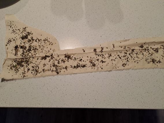 GMan was keen to clear out the garden bed where they were so today I checked them and found dozens of seed heads with literally hundreds of seeds. I collected them, rinsed the detritus from them and spread the seeds out on a scrap of calico fabric to dry.