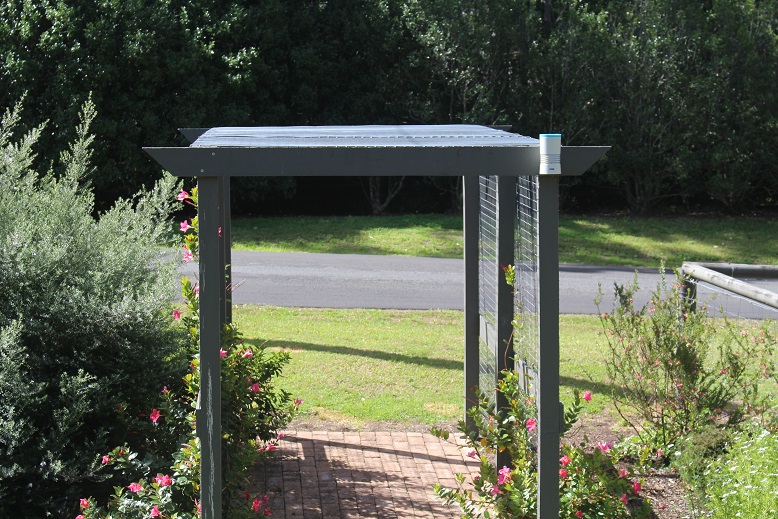 The gauge with sensor is mounted on the pergola (top right-hand corner).