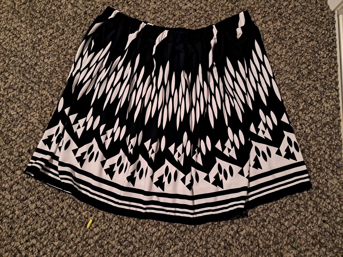 Finally, I added this skirt after making it yesterday. It is navy and white which fits in nicely with several other pieces in my wardrobe. The fabric is a drapey 4-way stretch and not something I necessarily would have chosen myself. I was asked to make a skirt and the lady provided the fabric which had a border print along both edges and since the fabric was very wide I had an unused strip which she was happy for me to use so I decided on this skirt for myself. It is probably a bit shorter than I would normally wear but I have thrown caution to the wind and decided it would be a perfect addition for casual beachside wear.