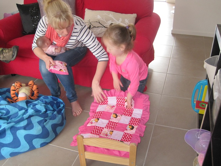 Most of the fabric has been randomly collected from op shops and offcuts from various previous sewing adventures. However, there will be some from a particularly special piece. The small pale pink squares have history. They are from some leftover fabric from a dress which my mother made for herself – probably close to 30 years ago. From those leftovers I made a dress for my granddaughter which she wore on her first birthday.