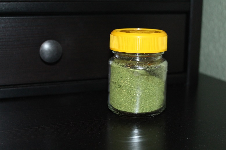 Here is a tiny Vegemite jar which is about 3/4 filled with 37g (a little over 1 ounce) of powdered dried celery. This is the yield from a full (albeit small) bunch of celery from our garden. Along with some of the onion powder, this is the beginning of my home-made stock powder.