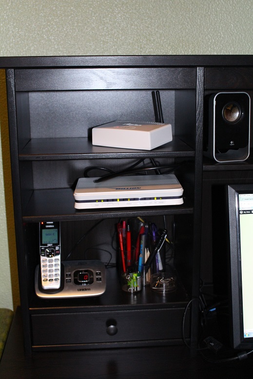 There is a small cupboard on the wall above one end of the desk. This is where we keep the modem as the power point and connection are there.