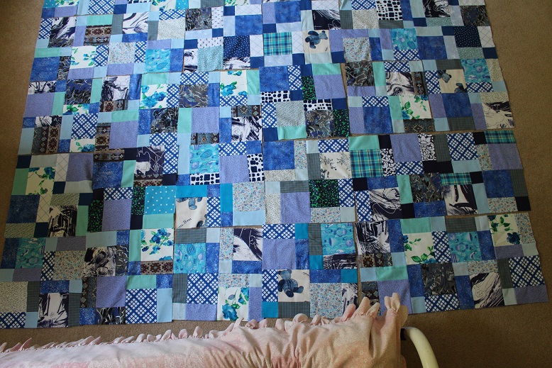I am pleased to report that the entire project is finished. I did not do the quilting as I have neither the skill nor the equipment to quilt such a large piece. My primary aim was to make a piece of patchwork which used all of the blue-toned fabrics and to declutter some of the bits of fabric that I had be hanging onto for far too long. All have been salvaged from one source or another, with many of them being scraps of homemade garments from various family members. What wonderful memories!