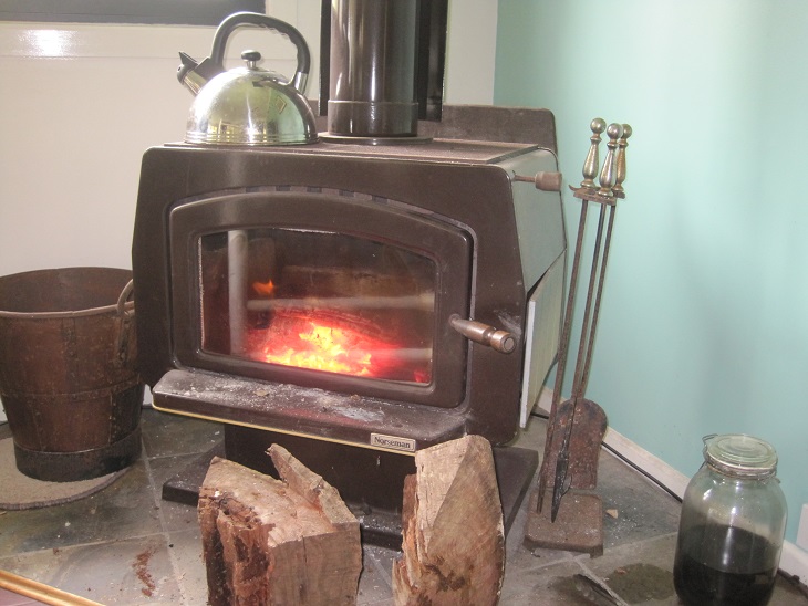 I put the kettle on top of the heater to heat some water and you can also see the wood drying out which will be added to the fire later.