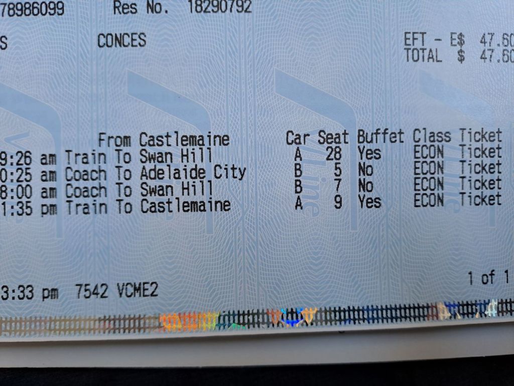 The first leg is to catch the train from Castlemaine to Swan Hill. We will arrive around lunchtime so are staying in a cabin at the caravan park which is conveniently located between the railway station and the river. We will have time to have a look around the town and enjoy the river scenery.