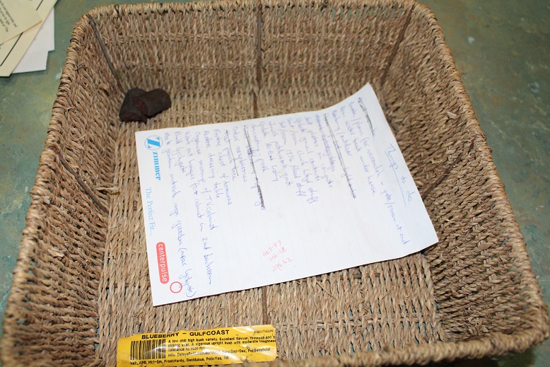 The yellow tag is the variety of blueberry bush which The Duke wants to buy to replace a couple that did not survive.  We will not be buying these until the weather cools down a bit so what better place to keep it than in the filing basket?
