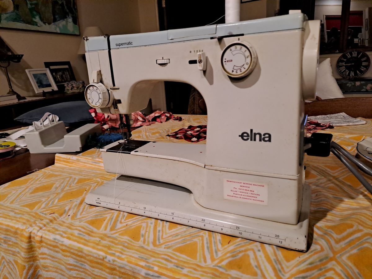 At the end of my last post I mentioned that I had been able to borrow a sewing machine. This is not just any sewing machine. It is a very solid metal Elna machine which was made in Switzerland. A bit of research indicates that it dates to the early to mid 1960s.