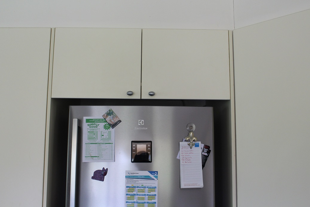 I have chosen a small space – the cupboard above the refrigerator.  This sees very little activity usually but it has been opened several times a day over the past week.  You see, we have a new refrigerator which fits easily in the available space, however, the doors on the overhead cupboard were custom-made to suit the old refrigerator so they need to be opened every time we go to the refrigerator at the moment.  The cabinetmaker is coming on Friday to remove and modify the doors.  Having this cupboard opened regularly has reminded me of what I have stashed in there and how infrequently it is used so I have decided it is time to take everything out and have a serious look at why it is there.