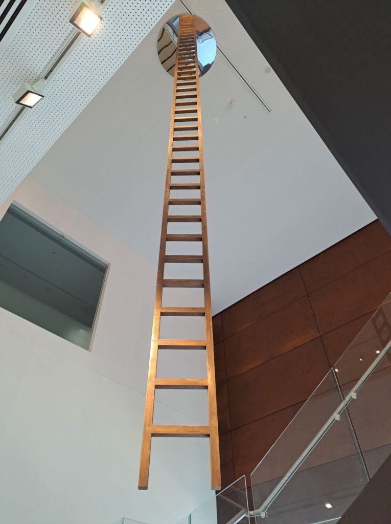 On the way up the central staircase I spotted this artwork. It is actually a timber ladder suspended from the ceiling against a circular mirror which creates the illusion of the ladder extending infinitely upwards. Really intriguing………….