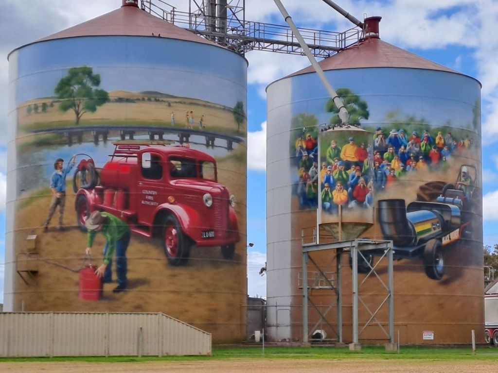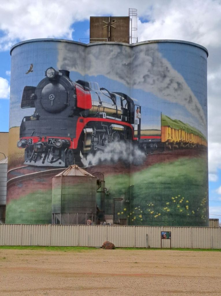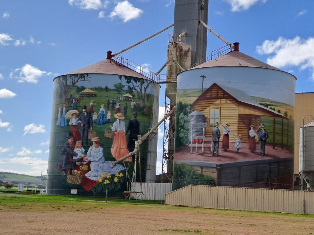 We made one more stop on our way home. These photos show some silo art at Colbinabbin. The series was too big to fit into a single photo so the 3 photos show the sequence. The idea of painting a silo began in 2015 in Western Australia and has expanded since then to encompass silos, tanks and water towers in dozens of rural towns across the country. The themes are many and varied but always have a strong local influence. The resultant Art Trails have reinvigorated many of the rural communities.