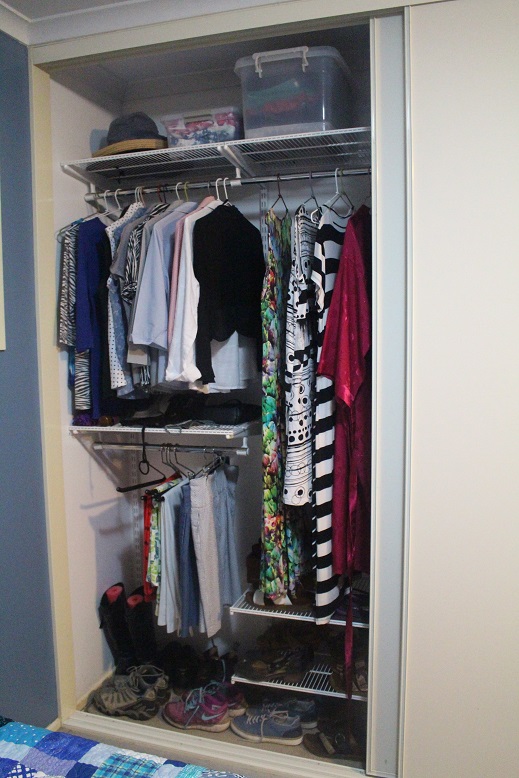 The size of the reduced wardrobe is 1800 x 1800mm (6 x 6ft). It is not huge but definitely enough for our needs. We have a total of 3.2 metres of hanging rail as well as several shelves for shoes. I have a couple of handbags which will live on the shelf below my shirts and tops. The high shelves will be for a box of beanies, gloves and winter scarves as well as hats and a couple of small backpacks. The hooks at the end hold belts and dressing gowns.